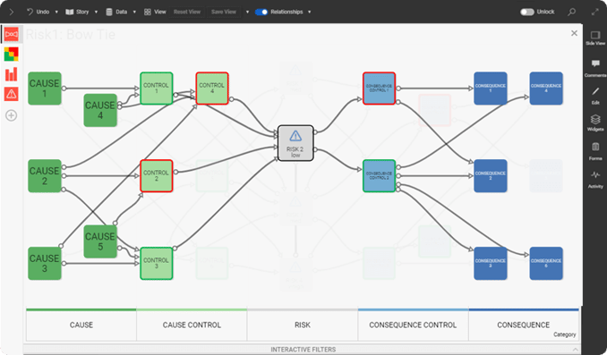 Static risk visualizations, like the bow-tie approach shown earlier, can be a good way to represent a brief overview of a current situation. However, for a more comprehensive ERM, a more in-depth approach is needed. Dynamic risk management software allow users to dive in and out of data at will.