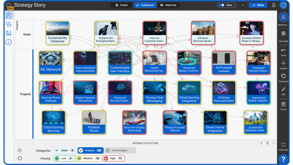 SharpCloud enables you to visualize your entire portfolio in one place, allowing you to see how various projects, resources, and strategic initiatives are interconnected. This broader view helps you understand the impact of each project on the overall business strategy, ensuring alignment between activities and long-term objectives. -