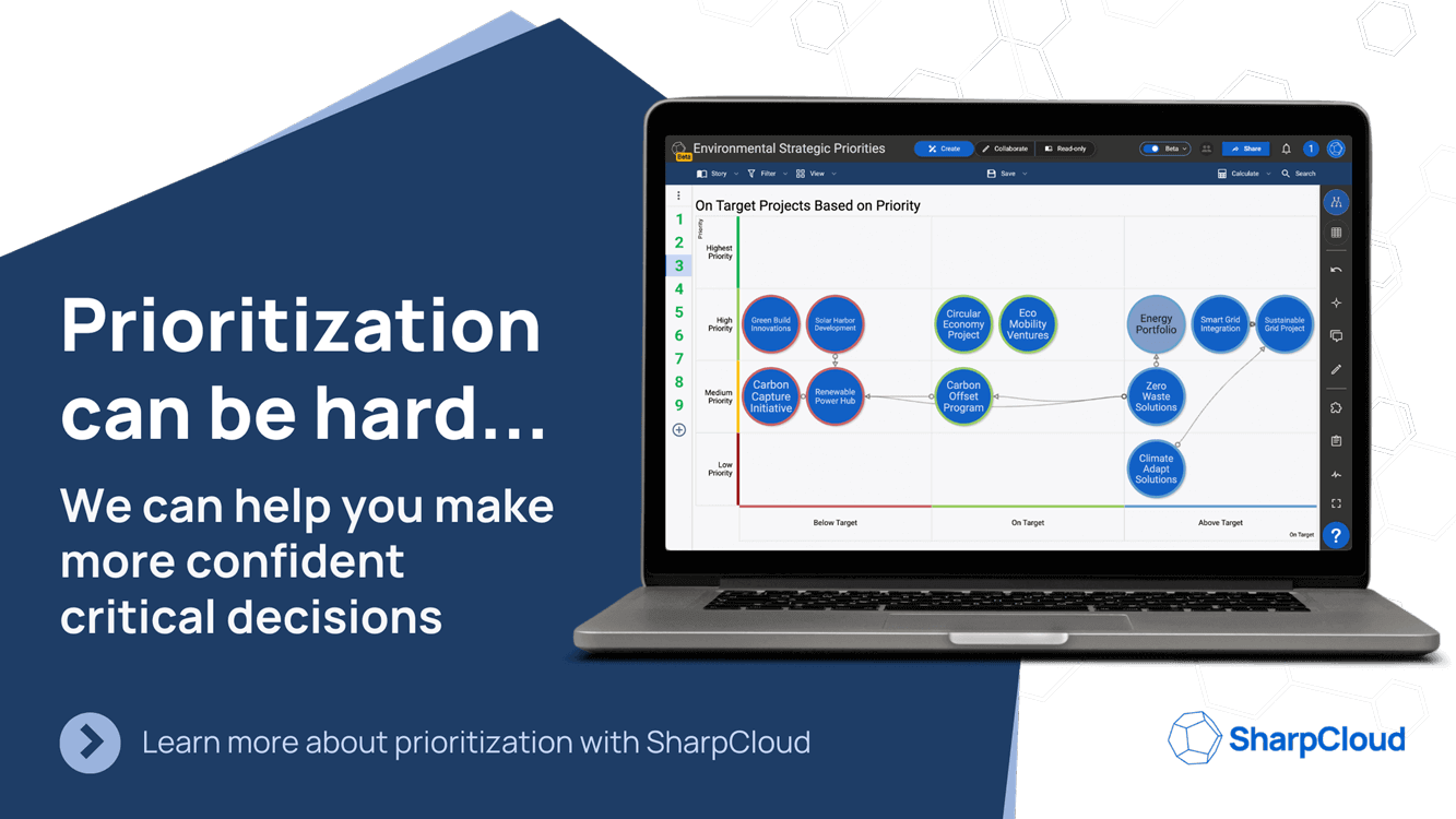 Effective project prioritization can make or break your organization’s ability to innovate and stay competitive. SharpCloud offers the tools you need to make those tough decisions with confidence, ensuring that your projects are strategically aligned and driving meaningful results.