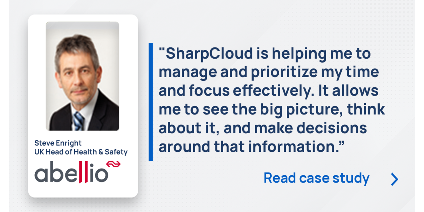 "I can now see the whole picture and what I’m doing across the scope of my responsibilities. I can see the high-level strategic aspects and below that, the stakeholders, actions, and working groups aligned to those goals. I can then drill down further into sources of data and link to external data and analysis for further information."- Steve Enright, UK Head of Safety, Security & Sustainability
