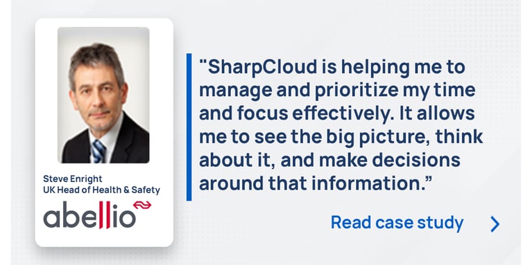 - SharpCloud is being used as a tool to help senior managers understand safety in their area and specifically the size of the project or challenge, what that looks like on a day-to-day basis, who’s responsible, how easy, or difficult that task is, what the outcome will be, and how that’s aligned to overall strategy.