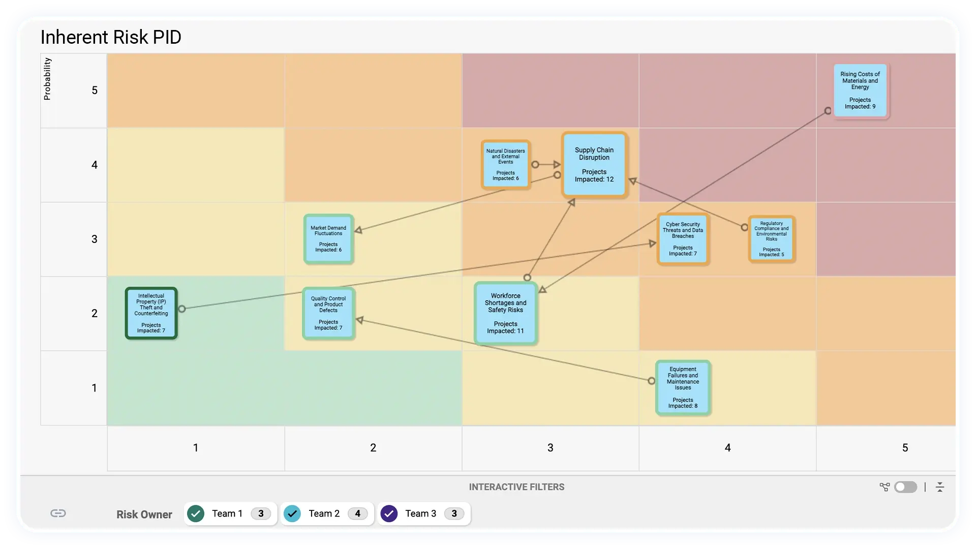 Connect risks to each other, controls, consequences, and business objectives to see how one risk can impact the entire landscape. Uncover dependencies, prevent cascading threats, and take proactive action with a holistic, real-time view.