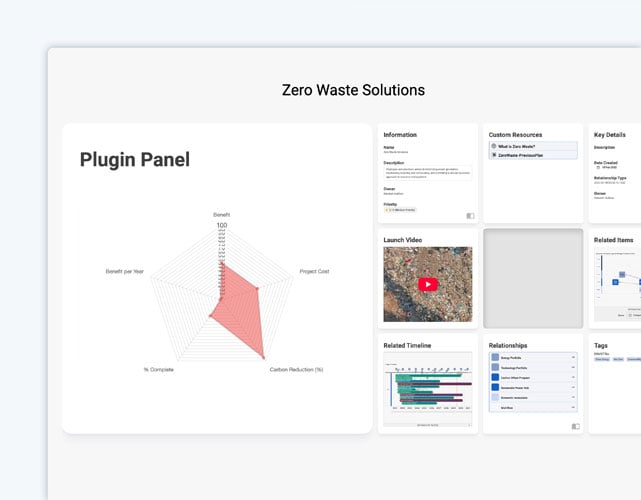 SharpCloud roadmap templates comes with several out of the box visualizations including timelines, strategic layer views, table and grid views. On top of the standard views, there are an extensive set of plugins which are used to extend SharpCloud's core functionality and views, including radar charts, heat maps, bubble charts and network diagrams. Further, if needed, users can implement their own code using either JavaScript, HTML or CSS to produce their own plugins to produce the custom visualization that's needed.